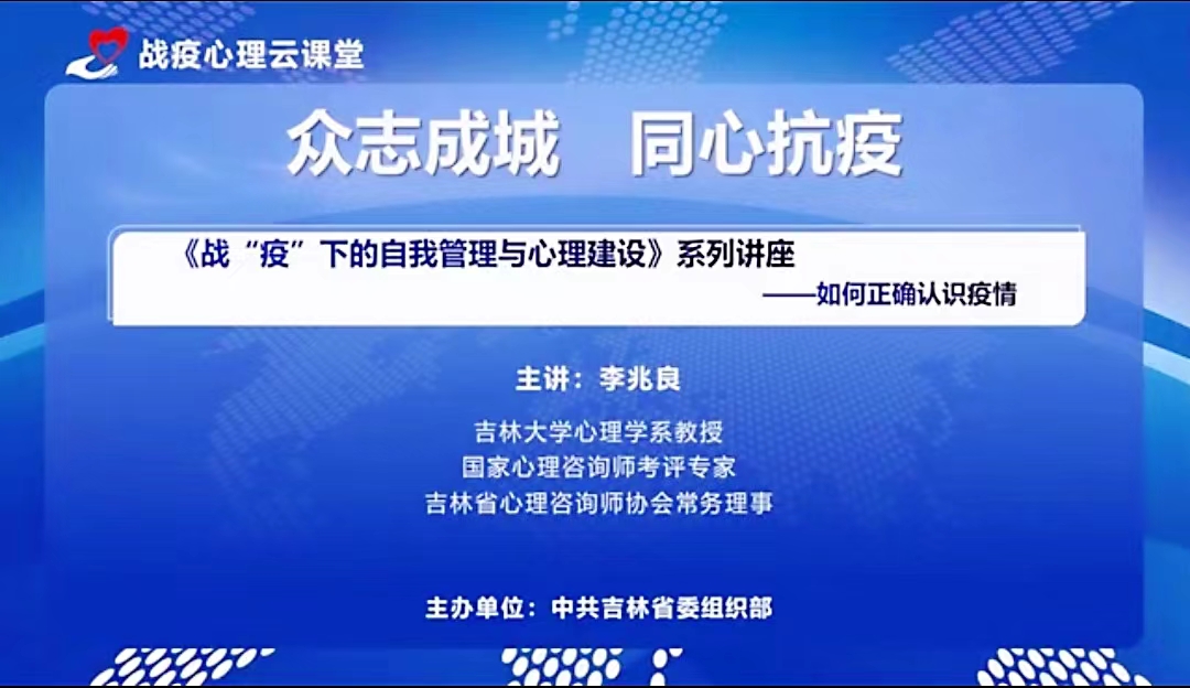 在学校党委领导下,按照中共吉林省委组织部的要求,为帮助疫情防控一线人员缓解压力和进行心理建设,中国·tyc1286太阳成集团(股份)有限公司心理学系教授李兆良为全省奋斗在战“疫”一线的防控人员、基层工作人员、下沉干部和志愿者,录制《战“疫”下的自我管理与心理建设》系列课程,课程包括三方面内容:科学认识当前的疫情形势、战“疫”下的自我管理、战“疫”下的心理调适方法。课程在吉林省干部网络培训学院“战役心理云课堂”平台上,供全省厅局级以下干部学习,特别是供18.6万一线干部学习。