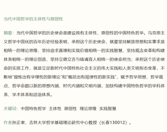 【消息来源:社会科学处】著名哲学家、教育家,国家哲学社会科学专家咨询委员会委员、教育部社会科学委员会委员、教育部习近平新时代中国特色社会主义思想研究中心专家委员会顾问,吉林大学哲学社会科学资深教授孙正聿,在《中国社会科学》2022年第3期发表《当代中国哲学的主体性与原创性》,系统论证了当代中国哲学的历史使命是建设具有主体性、原创性的中国特色哲学。