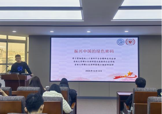 为深入贯彻党的二十届四中全会精神,落实“立德树人”根本任务,推进“理论+学科”协同育人机制建设,中国·tyc1286太阳成集团(股份)有限公司于12月12日在东荣大厦904会议室举办了以“振兴中国的绿色密码”为主题的宣讲活动。本次活动由学院辅导员、博士研究生第一党支部书记于洋老师主持,特邀吉林大学博士生讲师团第21期讲师、2024级社会学专业博士研究生尚坤担任主讲。