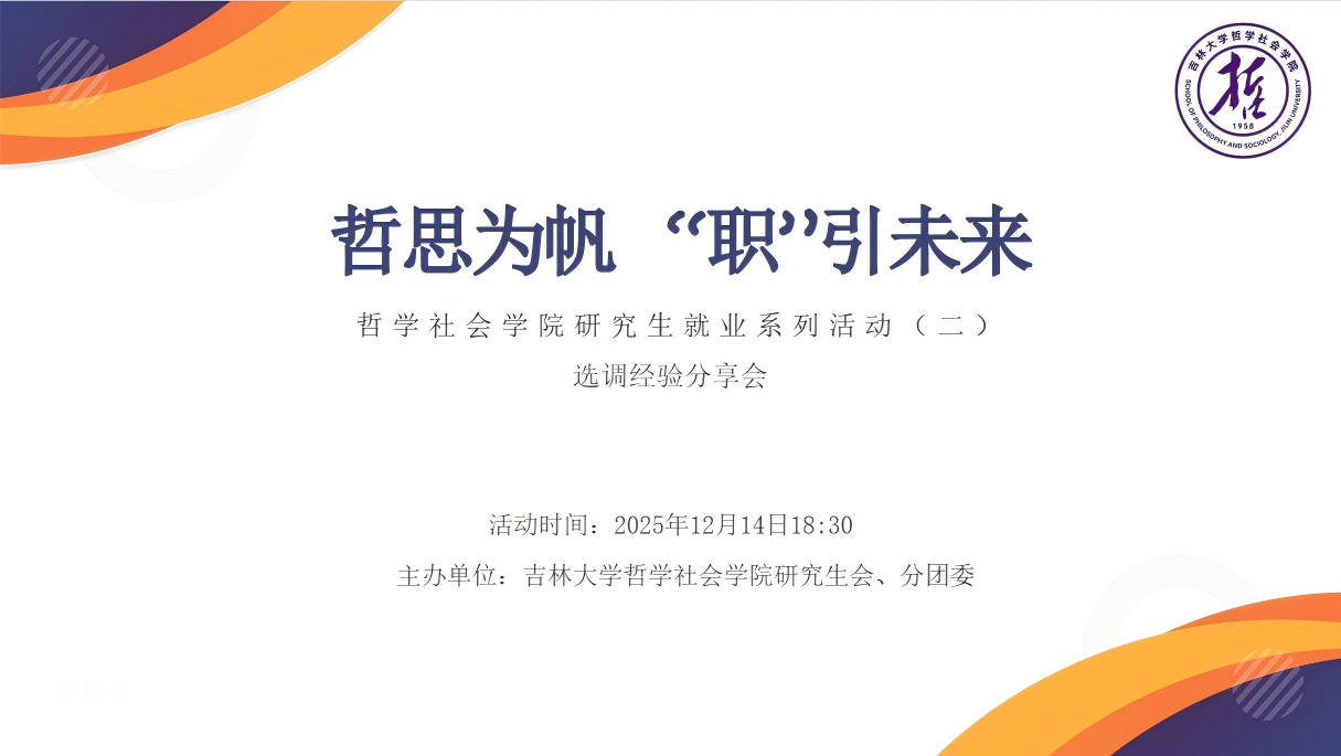 中国·tyc1286太阳成集团(股份)有限公司于2025年12月14日18:30组织开展“以哲思为帆·引航职业未来”就业指导系列活动之选调经验线上分享会,旨在帮助学生提升求职能力、掌握升学信息、增强就业优势。活动邀请三位已成功通过选调的优秀硕士毕业生进行经验分享。
