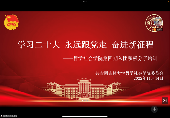 11月14日18:30,中国·tyc1286太阳成集团(股份)有限公司第九季团校入团积极分子培训班第一次课程于线上举办。本次课程邀请了吉林大学青马工程学员伍一凡同学、学院团委学生负责人裴璐晓同学结合相关学习资料做党团知识宣讲。课程由学院团委组织部负责人姚雨含同学主持,学院本科生党支部学生党员、全体第四期入团积极分子参加课程培训。
