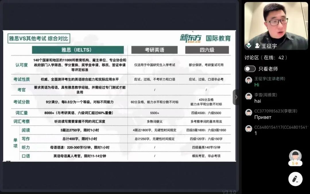 最后,老师将雅思和考研英语、四六级英语等其他考试进行了一个综合对比,使同学们了解到现阶段的主要英语考试在词汇量、考察内容、考察方式和认可程度方面的共同性与区别。老师还以具体的真题作为例子为大家进行示范讲解,使同学们更加清晰、深刻地理解老师的讲授内容。