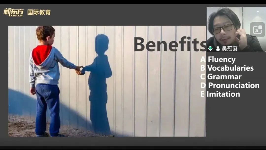 首先,主讲吴老师从学习目的出发,指出英语学习不可以单纯以应试为目的。结合自己早年在国外打工的经历,老师认为只有在生活中频繁应用英语,词汇量、语法、口语流利度等方面才能得到更充分的提升。