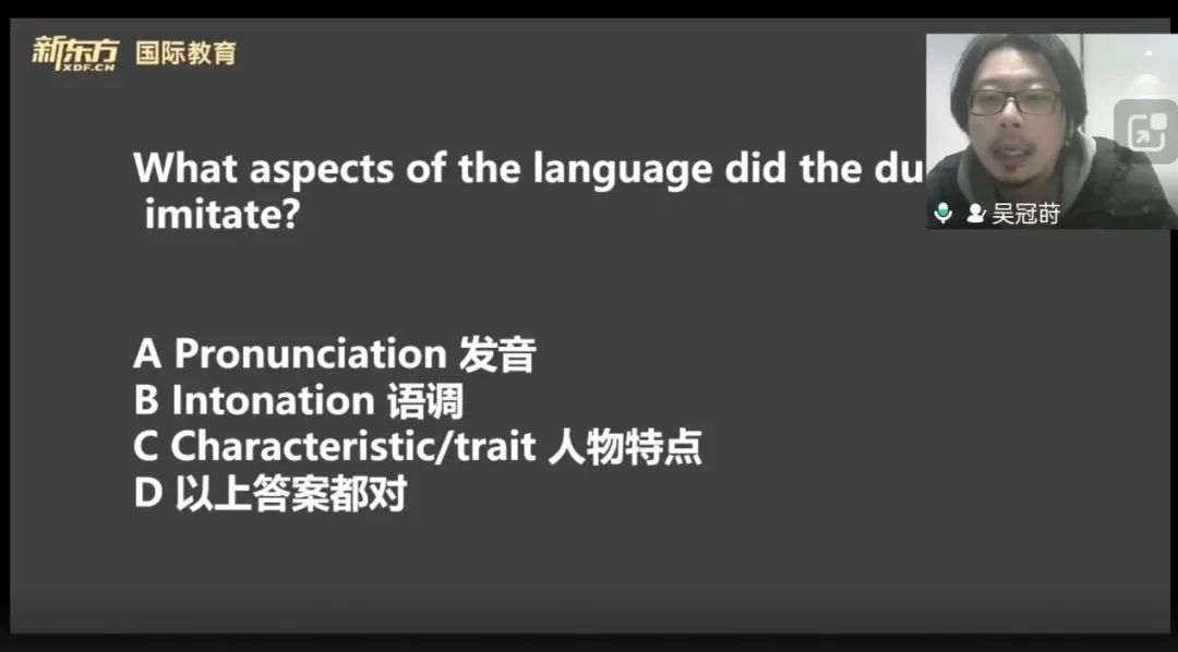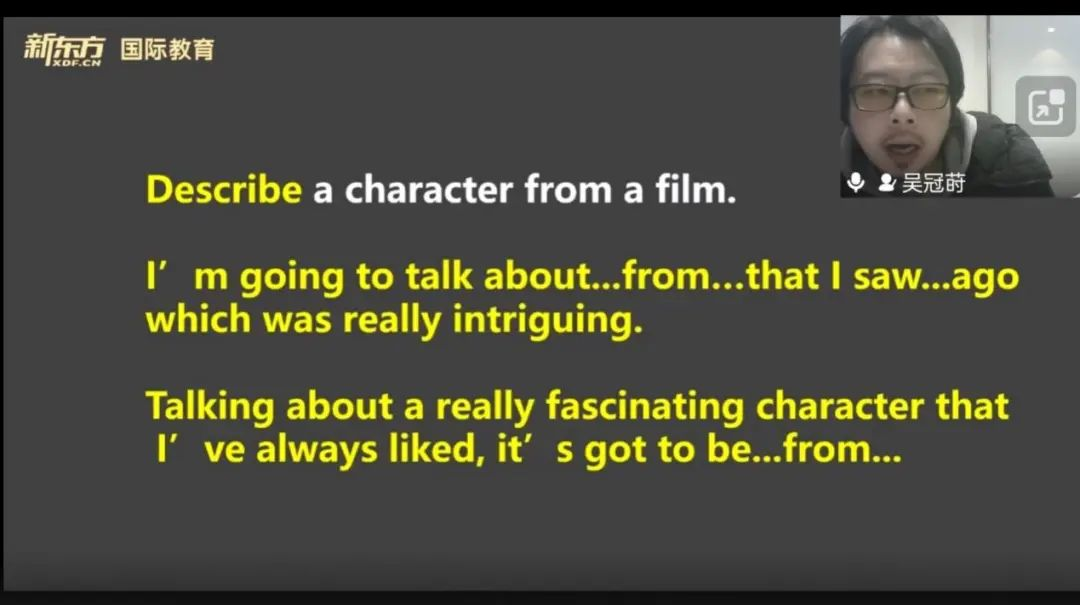 接着,吴老师播放了自己为影视剧作配音的视频,帮助同学们更好地感受英语口语的要点:发音、语调、环境等等。老师结合自己的配音经验,为同学们的口语练习提出建议,并在此基础上,引出“介绍一个电影角色”的雅思考题。