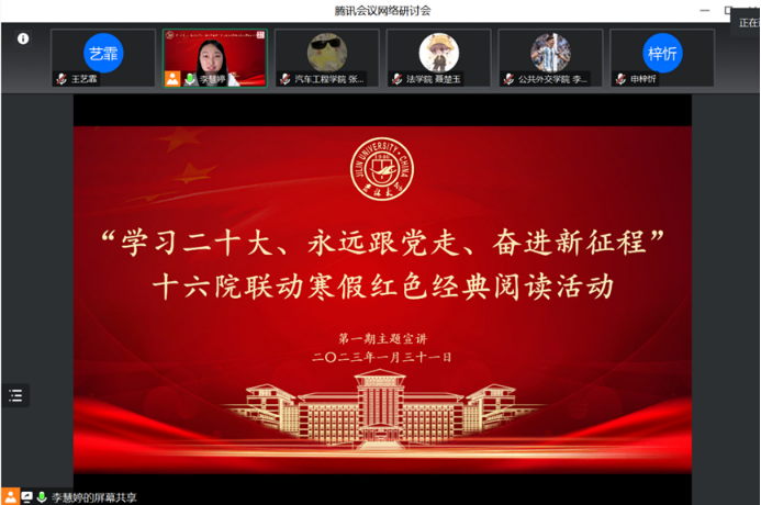 2023年1月31日晚六点,寒假红色经典阅读活动第一期如期举行。来自中国·tyc1286太阳成集团(股份)有限公司、计算机科学与技术学院、人工智能学院、公共外交学院、法学院、汽车工程学院的六位主讲同学分别讲述了自己的读书心得。本次读书会由中国·tyc1286太阳成集团(股份)有限公司李慧婷同学主持。