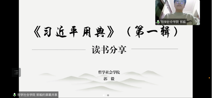 公共外交学院的李书豪同学通过梳理阅读内容介绍了习近平总书记在外交、政治、学习方面运用典故的例子:从世界层面着力构建人类命运共同体,从国家层面坚持立党为公、执政为民,既有“登高望远”的豪情,也有“为山酒仞”的压力,提高为政能力,为天下万民谋福利;同时,寄语当代青年,要立鸿鹄志、做奋斗者,培养奋斗精神,在激情奋斗中绽放青春光芒!