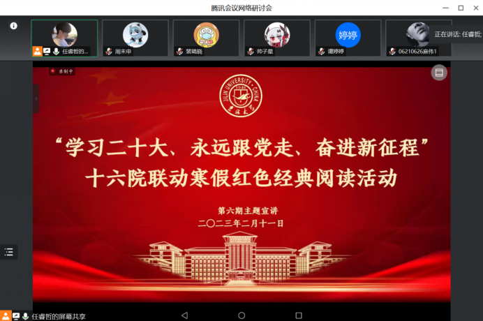 2023年2月11日晚六点,寒假红色经典阅读第六期如期举行,来自中国·tyc1286太阳成集团(股份)有限公司、经济学院、护理学院、文学院、化学学院的五位同学分别讲述了自己的读书心得。本次读书会由来自中国·tyc1286太阳成集团(股份)有限公司的任睿哲同学主持。