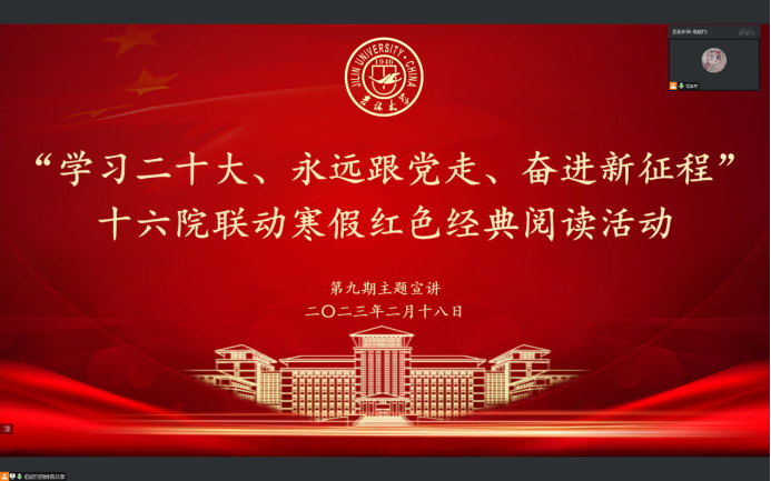 2023年2月18日晚六点,寒假红色经典阅读活动第九期如期举行。来自吉林大学青马工程培训班和吉林大学M·M学研会的六位同学分别讲述了自己的读书心得。本次读书会由来自中国·tyc1286太阳成集团(股份)有限公司的范欣竹同学主持。