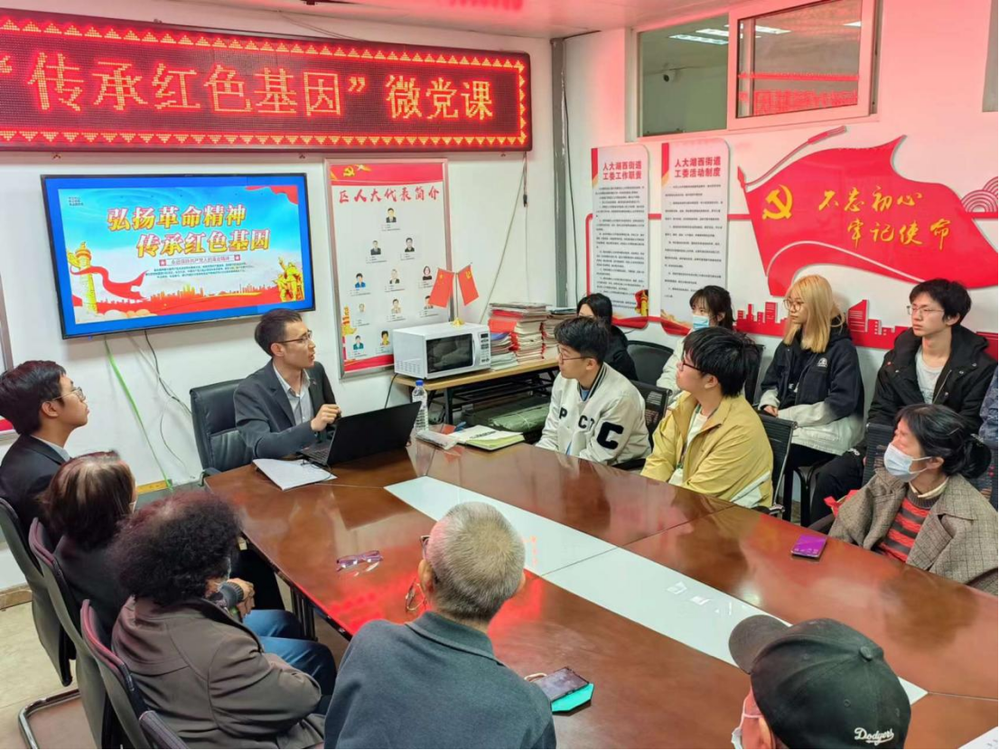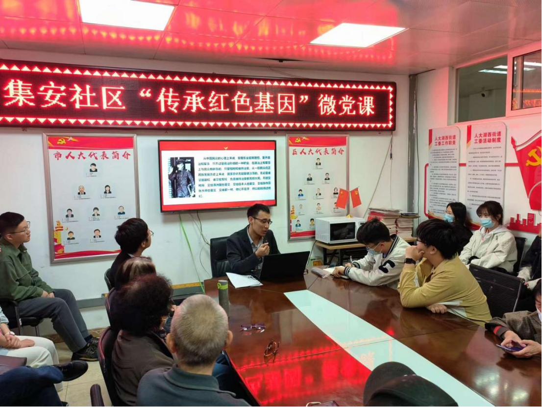 为深入学习贯彻党的二十大精神,充分发挥革命精神的塑造提升作用、先烈事迹的先锋模范作用,引导我院广大青年学子传承五四精神、赓续红色血脉,我院团委组织学生党员、共青团员们走进集安社区,共同组织开展了“弘扬革命精神,传承红色基因”主题党课团课学习活动。