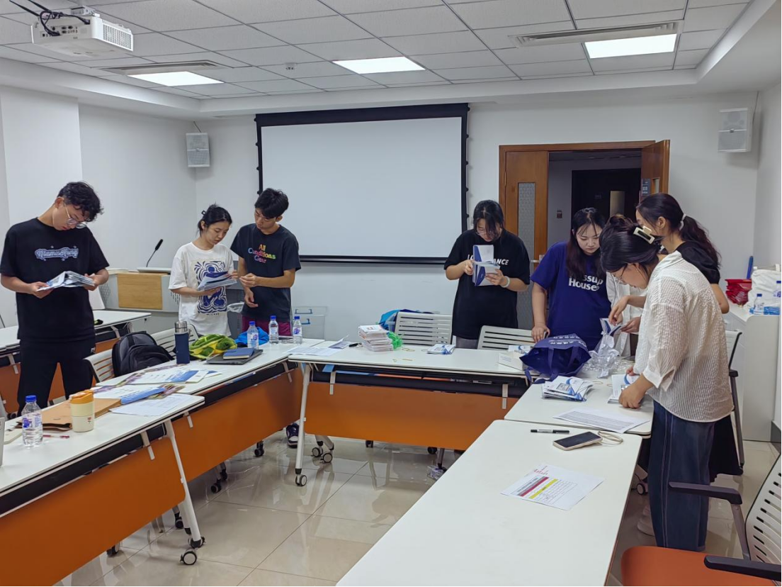 首先,根据有关通知,小组成员分批次前往各部门领取需要分发给新生的报到材料。结合我院新生人数较多,报到时间相对固定的实际情况,宋老师和同学们将领取的材料进行有效分类整理,并按照门类列出清单,逐一核对放入新生报到时领取的材料袋中。