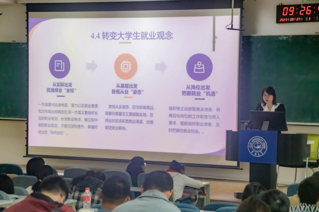 为强化职业生涯教育,协同推进就业育人,培养我院学生生涯规划意识,引导我院学生树立正确的就业观和择业观,9月27日,我院组织开展2023级本科生职业生涯教育讲座暨主题交流活动。本次活动邀请到吉林大学学生就业创业指导与服务中心副主任冯彦杰老师主讲,活动由我院辅导员宋绍伟老师主持,全体2023级本科生出席并开展学习交流。