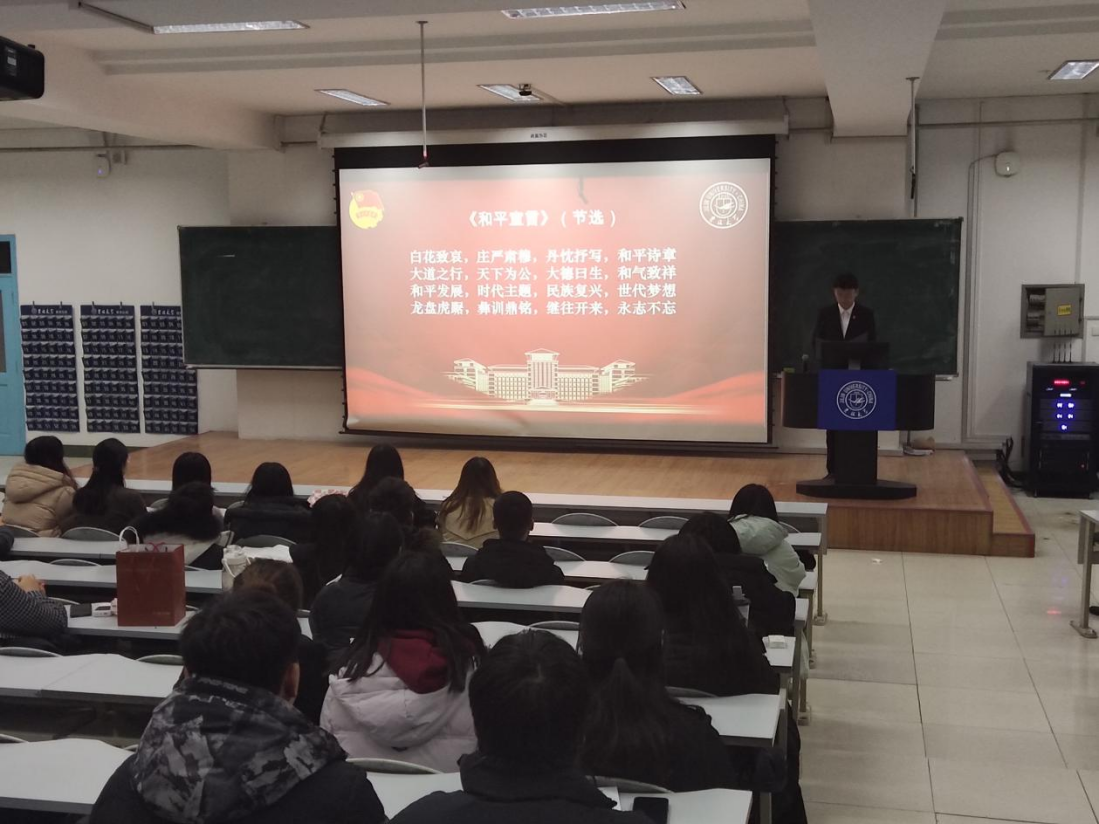 活动的最后,学院团委学生负责人房安国同学带领大家共同朗诵《和平宣言》(节选),以为激励。“继往开来,永志不忘”,一句句宣言时刻告诉着同学们:勿忘昨天的苦难辉煌,无愧今天的使命担当,不负明天的伟大梦想。