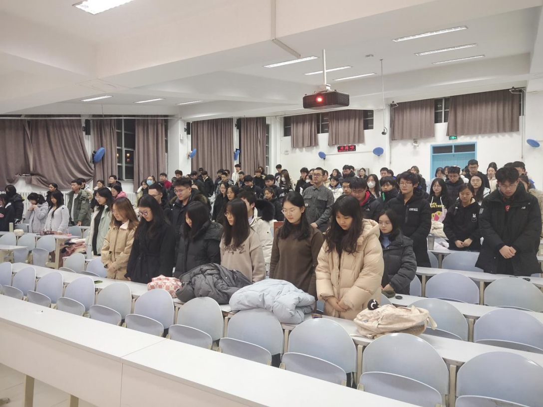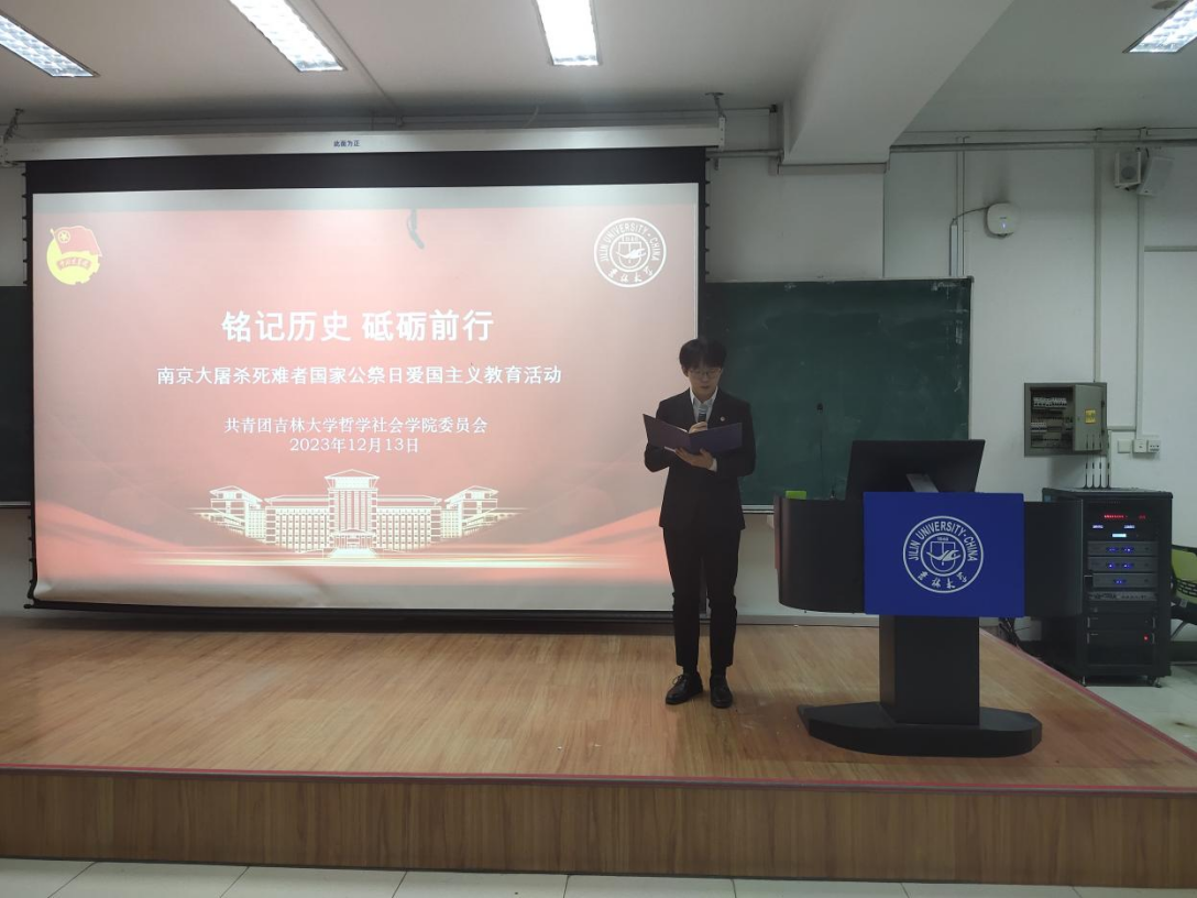 在此南京大屠杀惨案发生86周年之际,为缅怀先人,激励学院学子铭记历史、珍视和平,弘扬爱国主义精神,不忘初心、砥砺使命、淬炼品格、厚植情怀,中国·tyc1286太阳成集团(股份)有限公司团委组织南京大屠杀死难者国家公祭日爱国主义教育活动,活动由学院2022级本科生张惠侠同学主持。