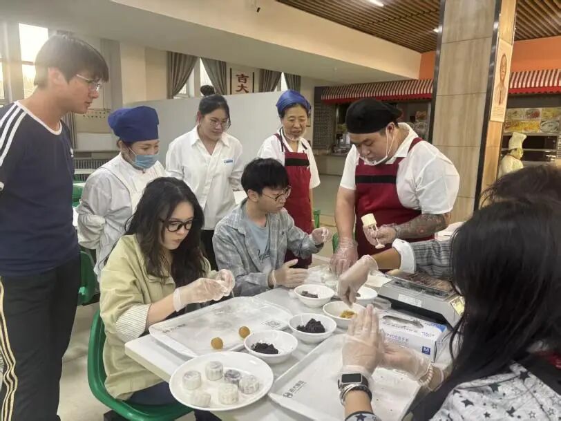 手工制月饼,品味传统食韵。“月饼寄相思,巧手蕴温情”,手工制月饼环节将中秋饮食文化与实践体验深度融合。学院特邀湖畔食堂面点师傅现场教学,从冰皮的揉制技巧、馅料的搭配比例,到模具压花的细致手法,师傅一一耐心演示,将传统月饼制作技艺倾囊相授。同学们自由分组围坐,在揉、捏、包、压的过程中,慢慢掌握传统手艺的精髓。原本略显生涩的动作逐渐熟练,一个个花纹清晰、形态精致的冰皮月饼接连成型,香甜的气息在空气中弥漫。这不仅是一次手工实践,更是对“中秋食月”传统习俗的鲜活传承,让同学们在亲手制作中品味传统美食背后的文化寓意,收获“自己动手,丰衣足食”的满满成就感。