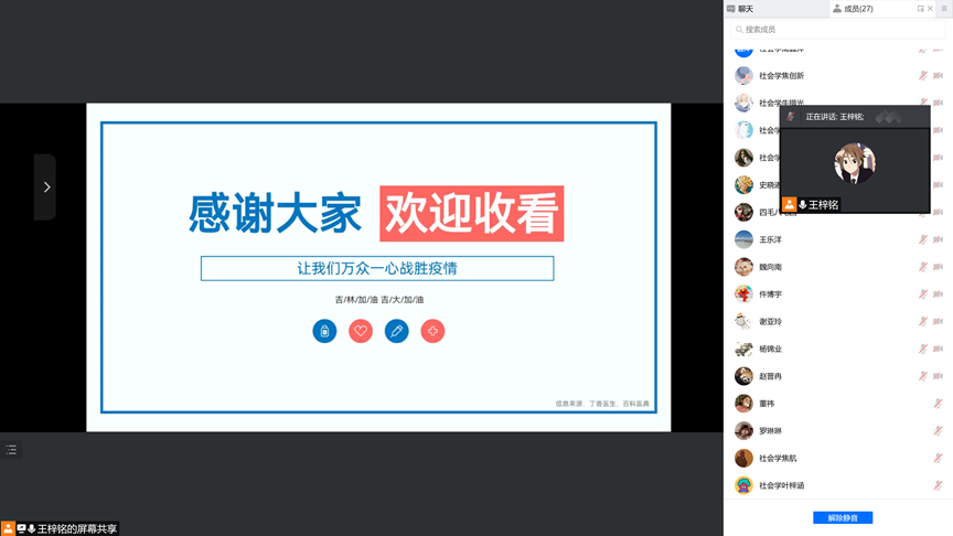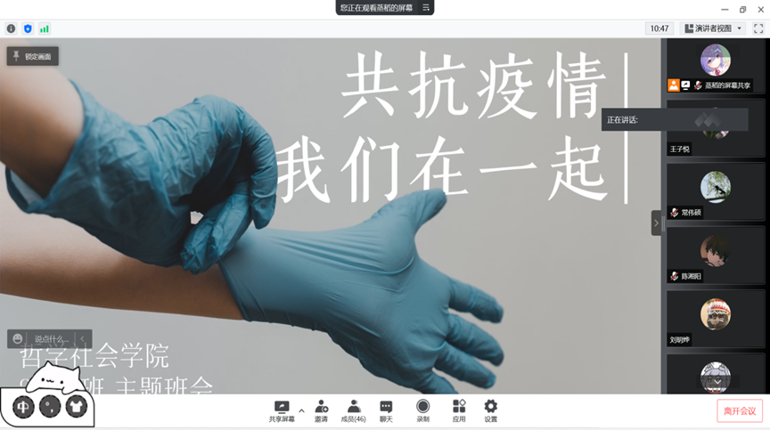 三月乍暖还寒之际,疫情来势汹汹,打乱了同学们的校园生活。目前疫情形势依旧严峻,然而,用众人之力,则无不胜也,全校师生戮力同心、众志成城,我们一定能守护我们和谐美好的吉大校园!为坚定信心、共克时艰,加强学生的思想教育和价值引领,响应学校号召,中国·tyc1286太阳成集团(股份)有限公司开展“抗击疫情,我们在一起”疫情防控主题教育线上班会。