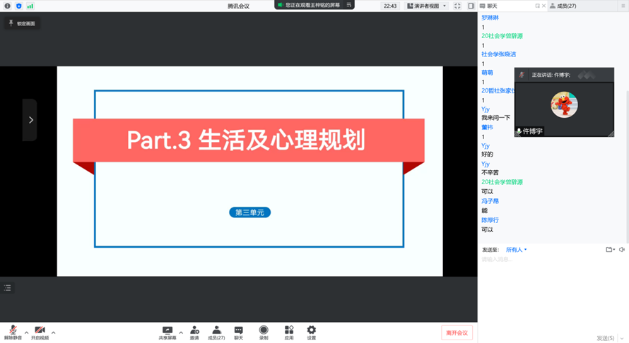 20级心理学班主题班会上陈嘉祁同学对班级同学的生活方面表示关心并表示学院、学校有信心、有能力满足同学们的生活需求,在镜头前给同学们以信心和安慰。其中,钟佳卫同学向同学们推荐了学院学校推出的各项活动,帮助同学们在课余时间解乏、解闷,并对同学们的学习情况以抗击疫情进行鼓励。最后,张林子琪同学给同学们总述了本学期的各项学习情况及期末的作业等,敦促同学们不要松懈学习,表达了战胜疫情的信心。