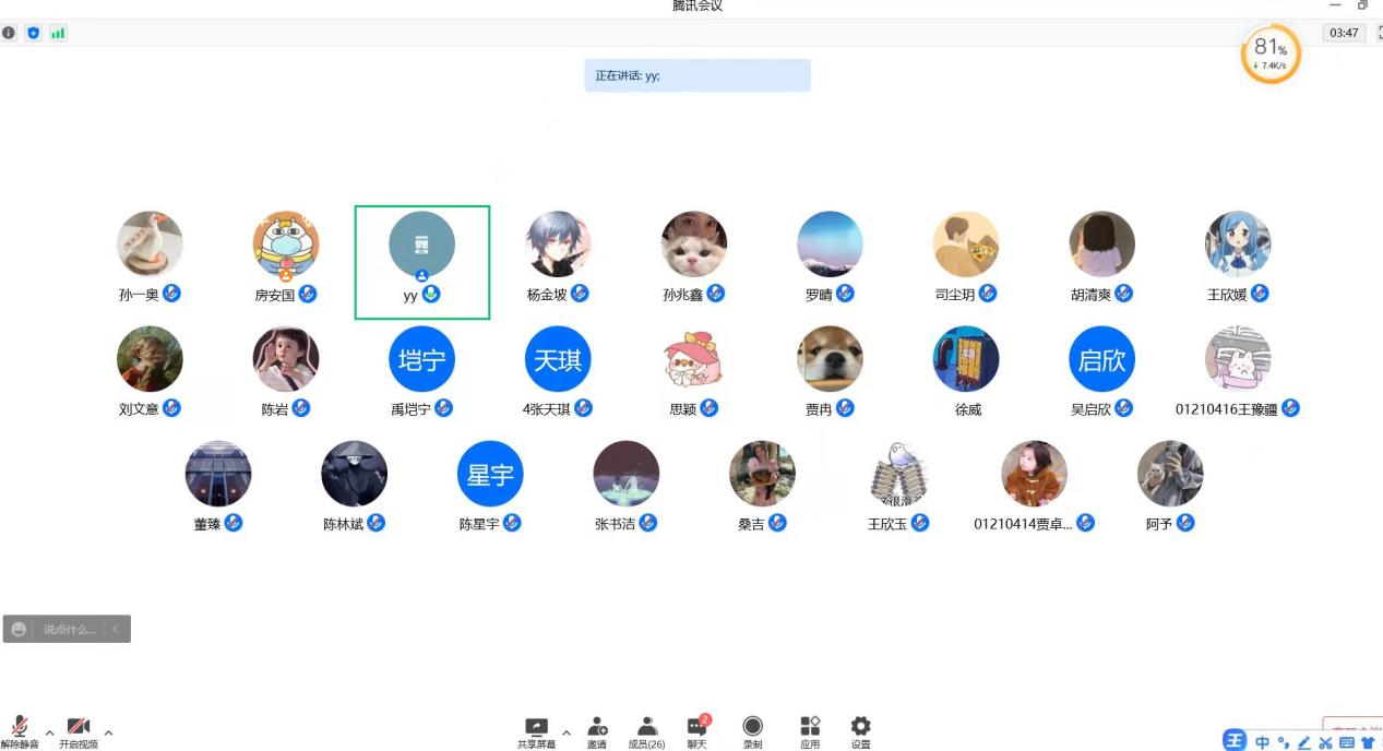 2班班主任李远老师通过腾讯会议首先详细地询问了同学们在封寝期间的生活状况、心理状况和学习情况,并表示长春市疫情已经持续了一段时间,学校全面静态化管理已经来到第二十二天,希望同学们不要松懈,继续遵守学校的各项防疫要求,保护好自己。其次,李远老师提醒同学们要注意多开窗通风,多利用寝室现有条件进行一定的体育锻炼,提高免疫力,减少生病的风险。然后,李远老师了解了班级同学担任学生志愿者的情况,叮嘱志愿者们在为同学们服务时也要做好自身的防护,保障自身的安全。最后,李远老师希望同学们不要荒废了这段特殊的封寝时光,要按时完成各项学习任务,在此基础上可以多读些感兴趣的书籍或看一些经典的电影,丰富自己的生活。