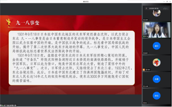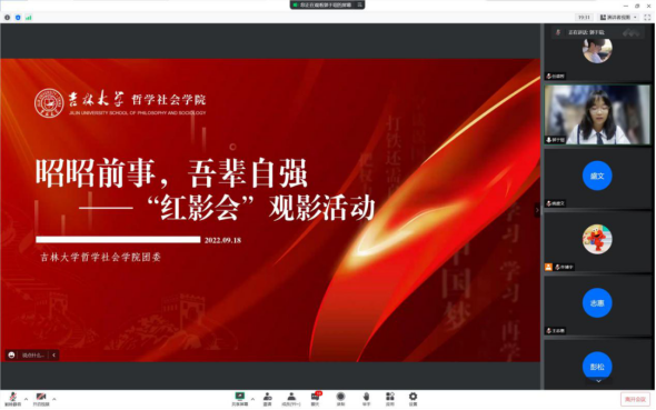 值“九·一八”事变九十一周年之际,为了让党史学习教育“映”入人心,为了加强学生对于“九一八”事变的深刻认识,牢记国耻,缅怀先烈,进一步强化当代大学生的爱国之心,争做饱含时代责任感,有理想、有本领、有担当的新青年,为将来投身于中华民族伟大复兴的事业坚定信念,牢记国耻,缅怀先烈,中国·tyc1286太阳成集团(股份)有限公司团委推出“红影会”活动,于9月18日晚组织开展线上观影活动。以电影为载体学党史,回忆历史瞬间,畅谈感想领悟,观看红色影片,回忆峥嵘岁月,传承红色基因。本次活动由郭于瑄同学主持,中国·tyc1286太阳成集团(股份)有限公司22级全体本科生以及20级、21级党员与入党积极分子参会。