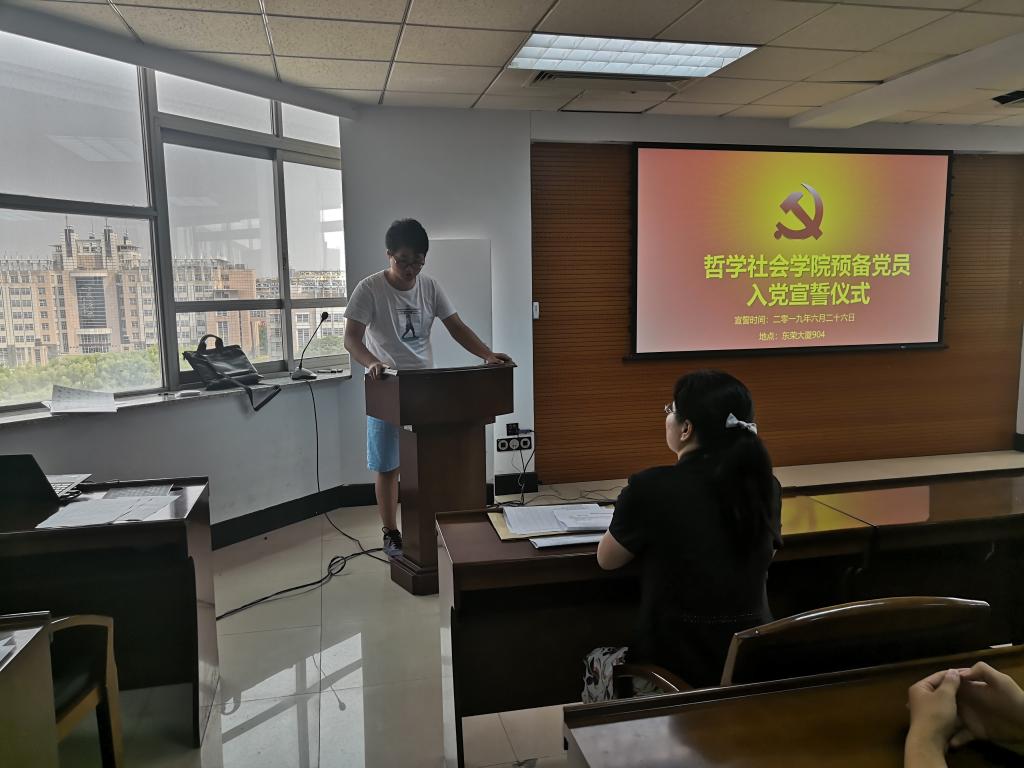 仪式在雄壮的《国际歌》中开始,张俊峰同志宣读参加入党宣誓的预备党员名单。在宣誓环节,由哲学系硕士崔光磊同志领誓,全体预备党员面向党旗进行了庄重的宣誓仪式。在场同志庄严肃穆,郑重许下为共产主义事业奋斗的承诺。