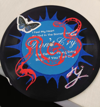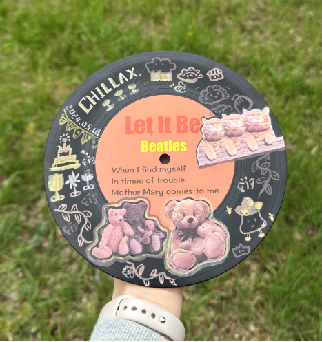 同学们在黑胶唱片上利用贴纸、素材纸、丙烯马克笔等材料进行了涂鸦创作,在此之中同学们沉浸入了艺术创作的心流状态,将他们的创意和想象力完全发挥出来。黑胶唱片涂鸦的创作过程也是心灵放松的过程,在此,他们得以远离压力与焦虑,放松自己。在涂鸦创作的同时,每一张唱片的背后都留下了参与者们的声音记忆,通过NFC贴片录入。同学们通过将声音录入NFC贴片,使得涂鸦黑胶唱片更具互动性与趣味性。每一张唱片背后都融合了同学们当下的情感和想法