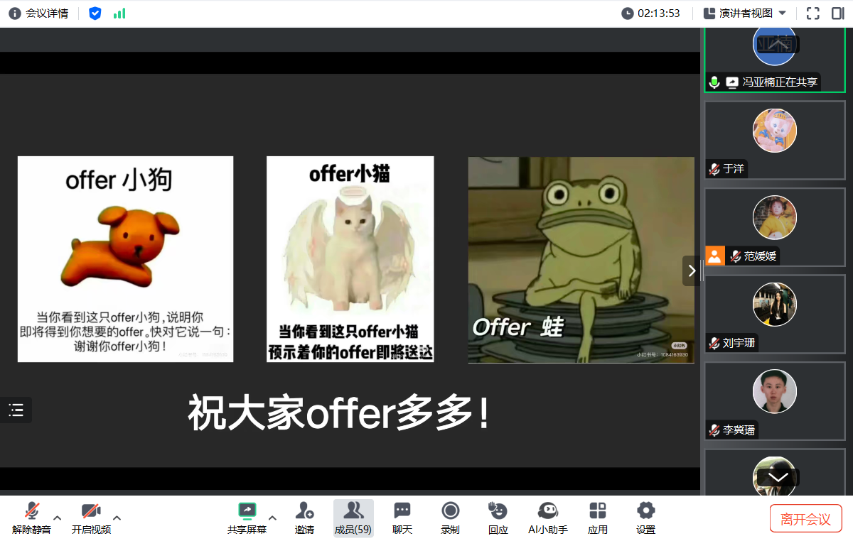 本次活动学院邀请到了分别就职于长春一汽集团及上海中铁十五局集团两位2024届硕士毕业生,两位同学结合自身的就业经历,从就业选择、求职信息检索、面试技巧以及签订三方协议等方面分享了自己的经验,同时也针对当前研究生的就业形势,鼓励同学们在找工作的过程中保持良好的心态和坚定的信心。在答疑提问环节,在校同学与两位优秀毕业生进行了充分交流。最后,于老师对入职后仍心系学院的两位同学表达了真诚的祝福与感谢,同时也鼓励同学们在求职时要坚定不移地朝着既定的目标锲而不舍地努力,保持阳光心态,多投简历多尝试,以充足的耐心和信心投入到求职就业过程中。