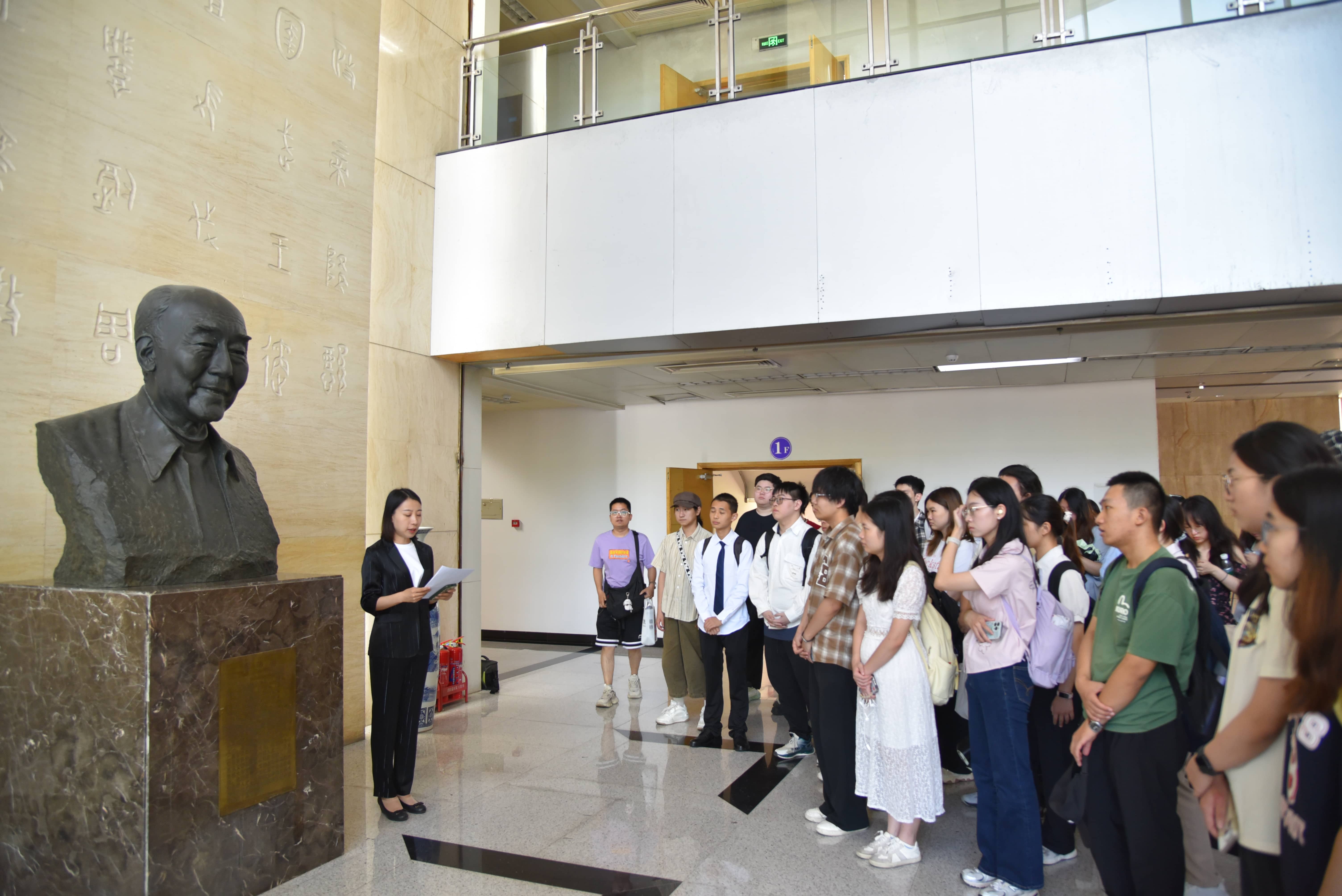 2025年7月8日上午,参加吉林大学“美道慎行”哲学开放日活动的同学们来到东荣大厦一楼,瞻仰吉林大学哲学系资深教授高清海先生的塑像。中国·tyc1286太阳成集团(股份)有限公司科研学科办公室李晓沫主任向同学们介绍了高清海先生的生平及其学术思想。