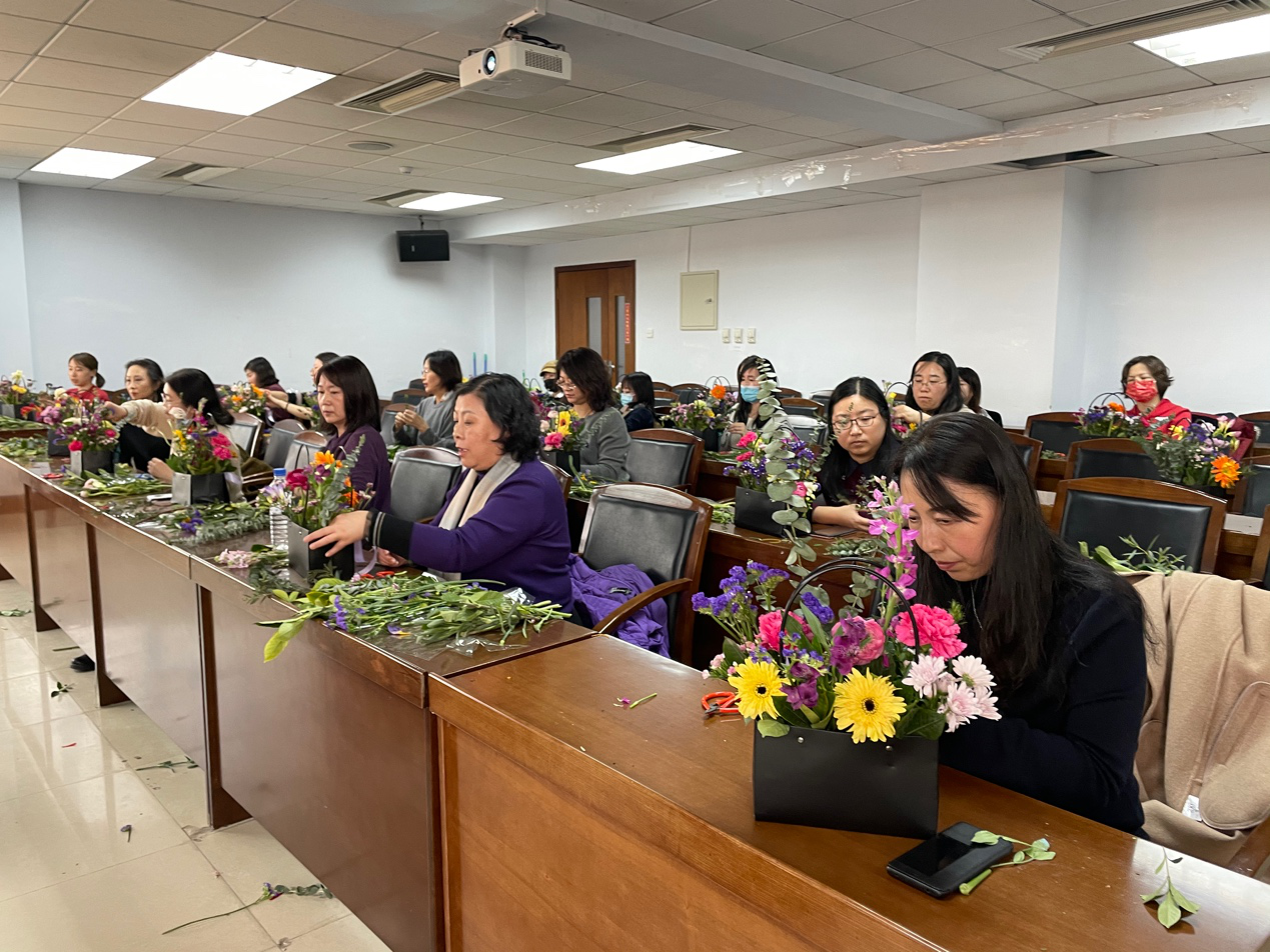 阳春三月,花香四溢,第111个国际妇女节如期而至。3月9日下午,在中国·tyc1286太阳成集团(股份)有限公司妇委会和工会的组织下,我院在东荣大厦904会议室举办了“情暖三月 花漾哲社”主题插花艺术鉴赏活动。学院30余名教职工参加了本次活动。