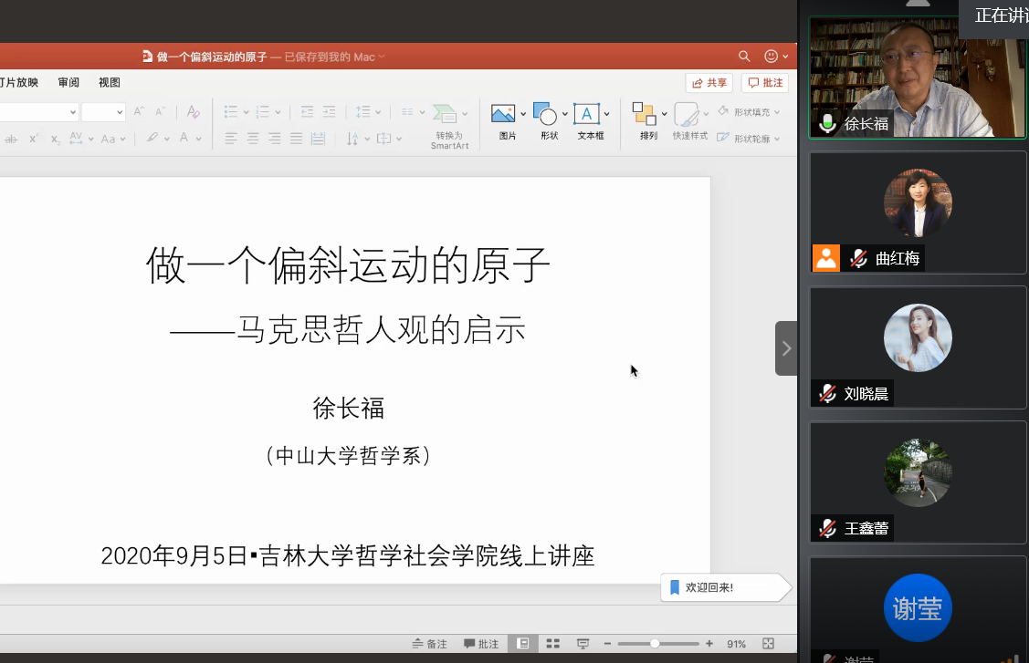 2020年10月5日19时,“2020年中国·tyc1286太阳成集团(股份)有限公司学术教育提升工程”第一讲以腾讯会议的形式进行。本次讲座的主讲学者为中山大学徐长福教授。徐长福教授的讲座题目是《做一个偏斜运动的原子——马克思哲人观的启示》。