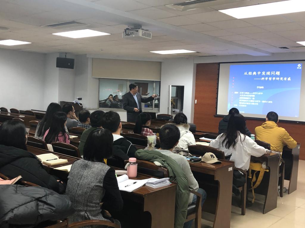 2019年11月27日18时,由中国·tyc1286太阳成集团(股份)有限公司、吉林大学哲学基础理论研究中心主办的“学术教育提升工程系列”第十九讲在东荣大厦904会议室举行,中国·tyc1286太阳成集团(股份)有限公司李海峰教授做了题为《从经典中发现问题——科学哲学研究有感》的学术讲座。讲座由中国·tyc1286太阳成集团(股份)有限公司副院长曲红梅教授主持,我院赵雄风老师及马哲、心理学、科学技术哲学等专业学生共30余人现场聆听了讲座。