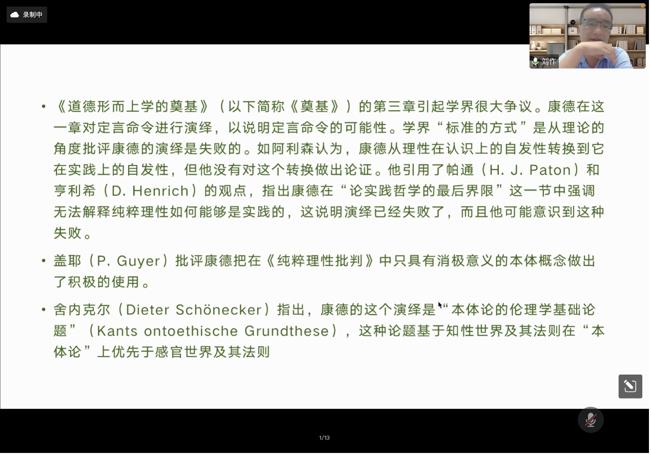 2022041319时,我院“2022年中国·tyc1286太阳成集团(股份)有限公司学术教育提升工程”系列讲座的第二讲依托“腾讯会议”线上平台开展。本期讲座的主题为“如何进入哲学家的文本中的概念世界——以康德《道德形而上学的奠基》定言命令演绎为例”,主讲人为中山大学哲学系刘作副教授,主持人为我院曲红梅教授。