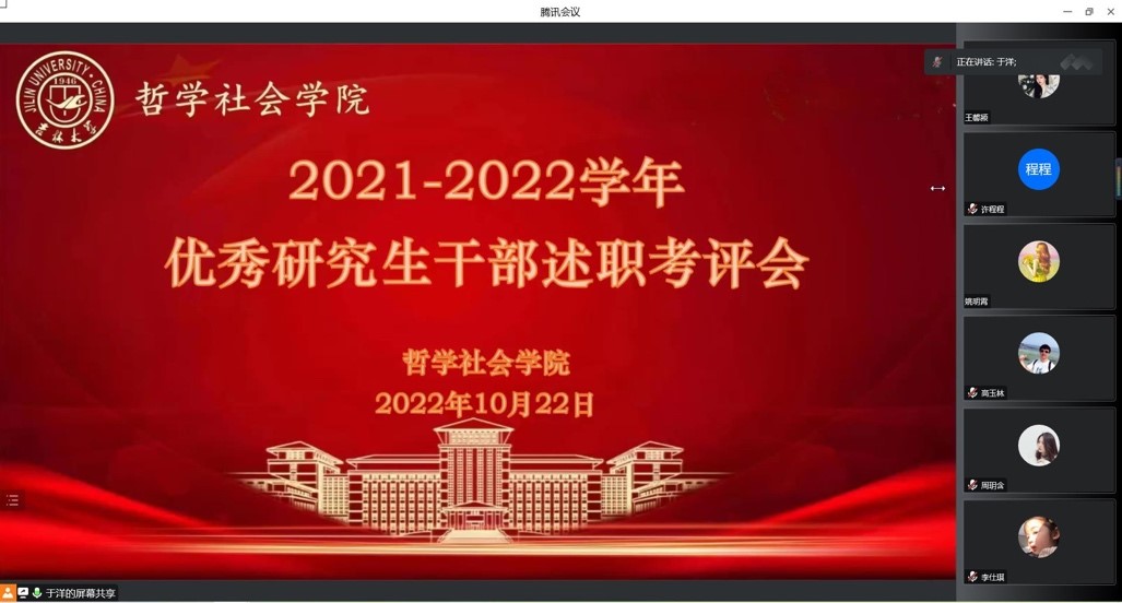 中国·tyc1286太阳成集团(股份)有限公司于10月22日召开2021-2022学年优秀研究生干部线上述职考评会。学院主管研究生思政工作党委副书记赵洁老师、副院长曲红梅教授、主管本科生思政工作党委副书记刘培强老师、研究生办公室主任傅瑜慧老师、研究生各学生党支部书记、研究生辅导员于洋老师、本科生辅导员宋绍伟老师及研究生学生代表参加此次会议.