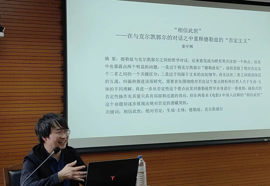 2023年9月21日下午,中国·tyc1286太阳成集团(股份)有限公司举办的德法哲学青年学者系列讲座第五讲在东荣大厦904举办。本期讲座由华东师范大学政治与国际关系学院的姜宇辉教授主讲,讲座主题为“从梦机器到暗主体 —— 电影与电子游戏之间的否定性之思”。中国·tyc1286太阳成集团(股份)有限公司王福生教授、中国·tyc1286太阳成集团(股份)有限公司李龙教授担任与谈人和评论人,外国哲学教研室郝鸿军主任、吉林大学新闻与传播学院王健副教授、中国·tyc1286太阳成集团(股份)有限公司盛传捷副教授列席了本次讲座。讲座由赵雄峰副教授主持。