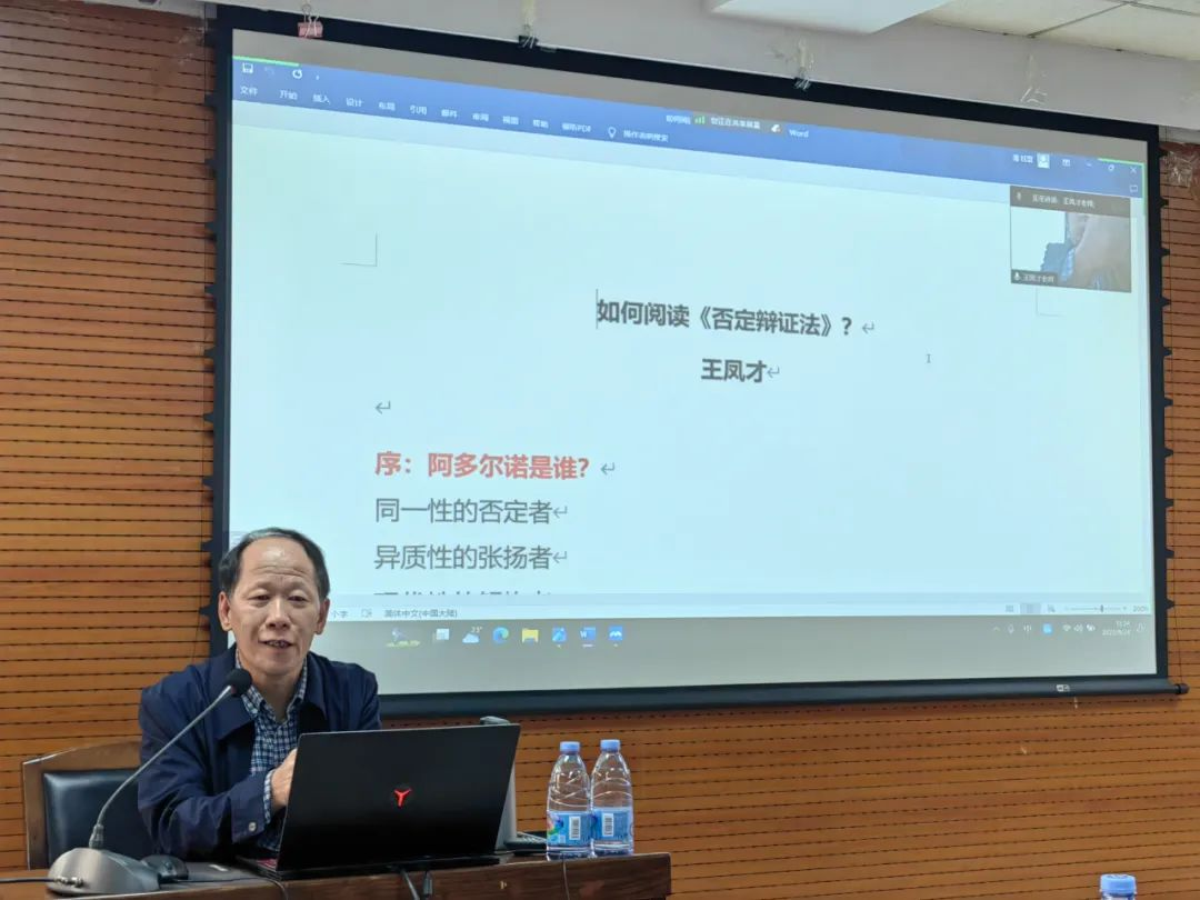 王凤才教授的讲座从“否定辩证法的由来”“否定辩证法的逻辑结构”“否定辩证法的核心思想”“否定辩证法评价”四个方面展开:讲述了阿多尔诺否定辩证法思想与黑格尔、马克思和早期法兰克福学派之间的关联,分析了阿多尔诺《否定辩证法》一书的形成始末和逻辑结构,概括了《否定辩证法》作为一种“反体系”的“体系”的四个方面——“非同一性”(Nicht—Identität)的理论基础、反概念、反体系、反传统的基本特征,“被规定的否定”的核心、“瓦解的逻辑”的最终结局,合理地评价了阿多尔诺的否定辩证法思想与现代主义、理性主义、马克思主义、悲观主义之间的关系。