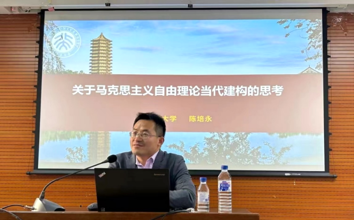 首先,陈培永教授提出做学问需要透过文字表象把握其内容思想,面向文本是青年学生走向学术之路的不二法门,面向时代是青年学者应当努力的方向。围绕“马克思主义自由理论的当代建构”这一主题,讲座内容主要分为四个部分:其一,从“赋权性自由”到“权能性自由”的阐释。陈教授指出不仅要强调人们自由的权利,还要赋予自由的能力,要保障大多数人自由的物质基础,以及自由的身体和生命前提。其二,陈教授通过阐释马克思的经典论断——“人的本质是一切社会关系的总和”,提出将人理解为“关系性个体”,而非“独立性个体”。其三,面对“资本逻辑已经成为制约现代人自由的主要因素”这一社会现实,陈教授提出“公权力塑造”不一定是“必要的恶”,我们需要强有力的“公权力”保障大多数人的自由。其四,借助马克思的共同体思想,陈教授表明只有在“真正的共同体”的基础上,才有可能实现普遍的自由。