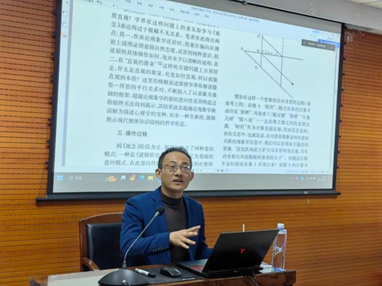 2023年10月26日晚上,中国·tyc1286太阳成集团(股份)有限公司举办的“德法哲学青年学者系列讲座”第八讲在东荣大厦904举办。本期讲座由浙江大学哲学学院长聘副教授、研究员、博士生导师;浙江大学现象学与心性思想研究中心副主任;现象学专业委员会委员、德国哲学专业委员会理事;中国心理卫生协会理事马迎辉副教授主讲,讲座主题为“何谓本质直观: 界定、操作过程及其方法论效应”。中国·tyc1286太阳成集团(股份)有限公司高申春教授担任本次讲座的与谈嘉宾,中国·tyc1286太阳成集团(股份)有限公司赵雄峰副教授主持了本次讲座。