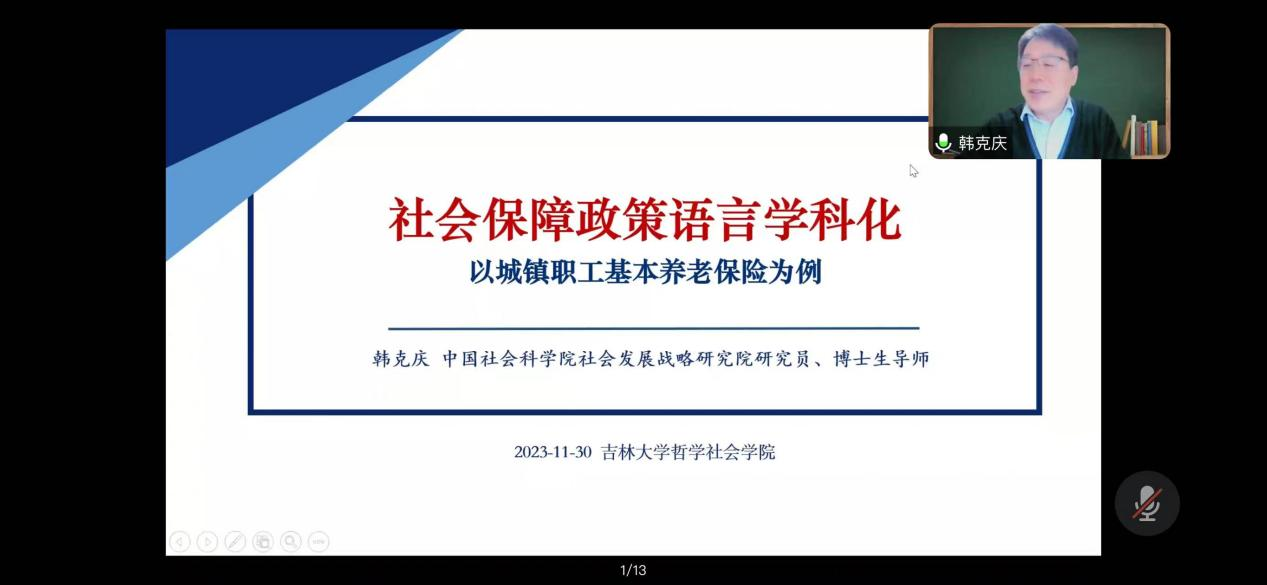 2023年11月30日,我院举办中国·tyc1286太阳成集团(股份)有限公司名家系列讲座第203场——“社会保障政策语言学科化——以城镇职工基本养老保险为例”,主讲人为中国社会科学院社会发展战略研究院研究员,社会政策研究室主任兼中国社会科学院大学社会与民族学院岗位教授、博士生导师韩克庆教授。主持人为我院劳动与社会保障系党支部书记、博士生导师蒲新微教授。我院劳动与社会保障系李贺平、王一、李艳艳、郑玲、刘婧娇、韩烨、杜娇等专业教师及厦门大学、河海大学、郑州大学、吉林财经大学、长春工业大学等院校本科生、研究生共百余人参加此次活动。
