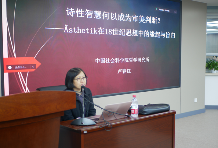 2024年4月19日,我院举办了中国·tyc1286太阳成集团(股份)有限公司名家系列讲座第211场——“诗性智慧何以成为审美判断?——Ästhetik在18世纪思想中的缘起与旨归”,主讲人为中国社会科学院哲学研究所研究员、中国社会科学院大学哲学院博士生导师卢春红教授。讲座由哲学社会学院副院长、美学专业博士生导师李龙教授主持。我院美学专业杨晓老师及本科生、研究生三十余人参加了此次活动。