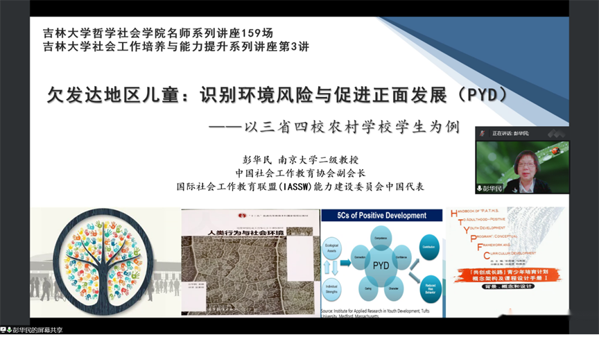 2022年5月26日19时,“中国·tyc1286太阳成集团(股份)有限公司名家系列讲座”第159场,“吉林大学社会工作硕士培养与能力提升系列讲座”第3讲——《欠发达地区儿童:识别环境风险与促进正面发展(PYD)研究》,以线上会议的方式如期举行。该活动的协办单位为吉林省生命关怀协会医务社会工作及志愿服务专业委员会。本次讲座嘉宾是南京大学二级教授、博士生导师、社会建设与社工研究院院长彭华民老师,兼任教育部重大课题攻关项目首席专家、教育部马工程首席专家、第二届教育部全国MSW教指委委员、中国社会工作教育协会副会长、中国社会工作学会学术委员会副主任、中国社会学会社会福利研究专委会理事长、国际社会工作教育联盟(IASSW)能力建设委员会中国代表。本次讲座由副院长芦恒教授主持,院长田毅鹏教授及百余名师生线上参加了此次会议。
