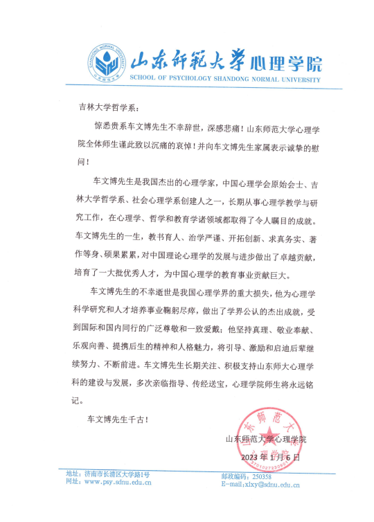 山东师范大学心理学院唁电