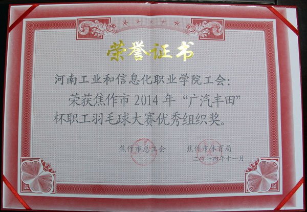 经过激烈角逐,我院参赛选手韩玮进入男子单打16强,我院代表队在男子团体比赛中获得小组第二名,我院工会荣获焦作市2014年“广汽丰田”杯职工羽毛球大赛优秀组织奖。