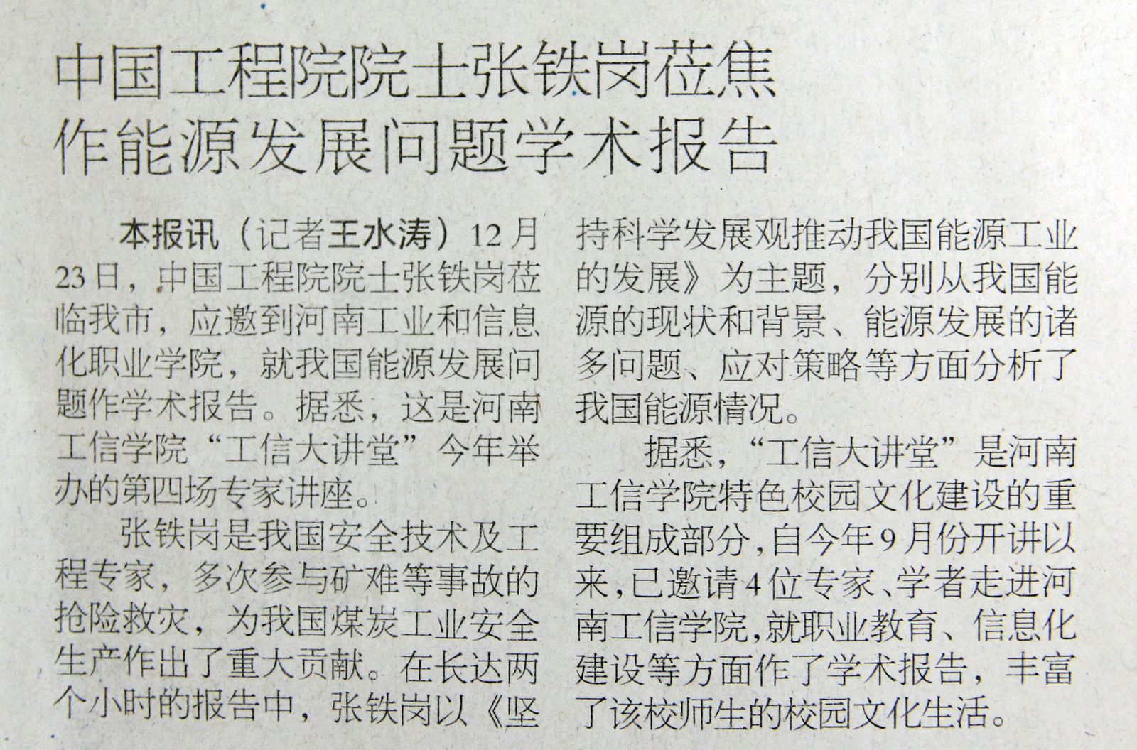 本报讯(记者王水涛)12月23日,中国工程院院士张铁岗莅临我市,应邀到河南工业和信息化职业学院,就我国能源发展问题作学术报告。据悉,这是河南工信学院“工信大讲堂”今年举办的第四场专家讲座。