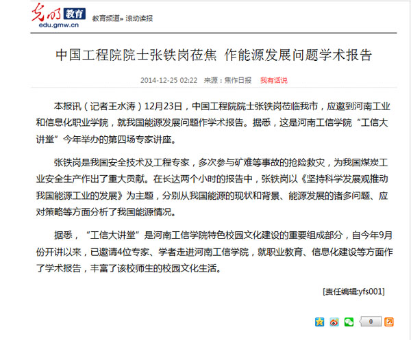 12月25日,光明网教育频道以《中国工程院院士张铁岗莅焦 作能源发展问题学术报告》为标题,报道了中国工程院院士张铁钢到我院做学术报告的新闻。全文如下: