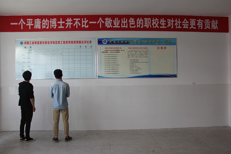 在新模式下的系部文化建设工作中,信息工程系旨在坚持健康积极的大学生舆论导向、构筑师生全方位展示交流平台、宣扬并凝聚青春正能量。目前,该系系部文化建设工作已初现成效,形成了独具一格的系部展厅文化、系办公室文化、班级文化、团总支及系学生会文化。通过悬挂横幅,张贴励志标语和“三风”建设倡议书,制作系部简介和专业建设喷绘,设置学生行为规范、十条须知和学生量化管理考核宣传栏,摆放优秀毕业生及素质教育展板,设计制作高校教师职业道德规范和辅导员、班主任就学生管理工作应知应会宣传板面等多种措施,结合海报、展板、标语等系部文化载体的设计、制作等多样化活动的开展,充分调动全系师生主观能动性,增强集体凝聚力,有力促进了该系系风、班风转变,逐步营造出系部、班级、学生会良好的工作学习氛围。