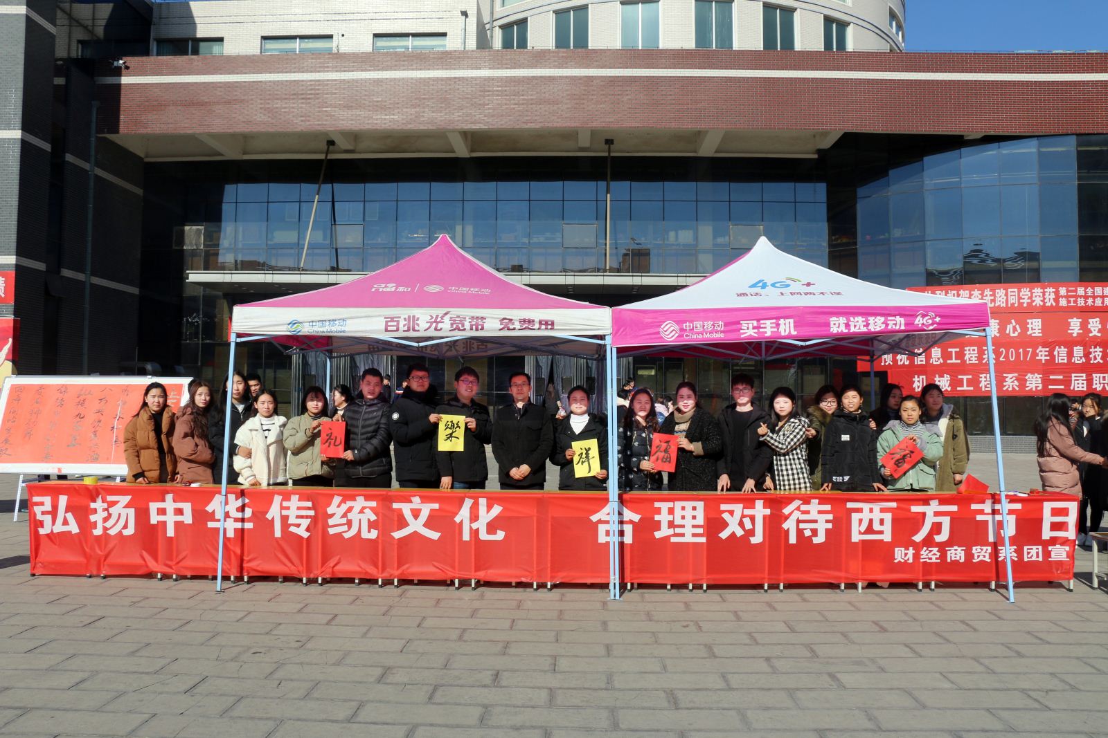 据悉,财经商贸系本次“弘扬中华优秀传统文化”活动包涵多个环节。除上述集中宣传活动外,该系还专门召开班主任会议,要求全体班主任提高认识,明确职责,及时把握学生动态,做好学生思想工作,并主动采取多种方式方法,帮助学生了解、认识中华传统文化精髓,不断增强文化自信。第二,在全系内开展主题班会活动。系统介绍春节、清明、端午、中秋等中华传统节日的由来和意义,大力弘扬中华优秀传统文化,加强爱国主义教育。第三,组织学生管理人员召开“圣诞节安全应急预案”工作会议,落实平安夜巡查活动,加强安全巡查力度,确保节日期间的安全、稳定。