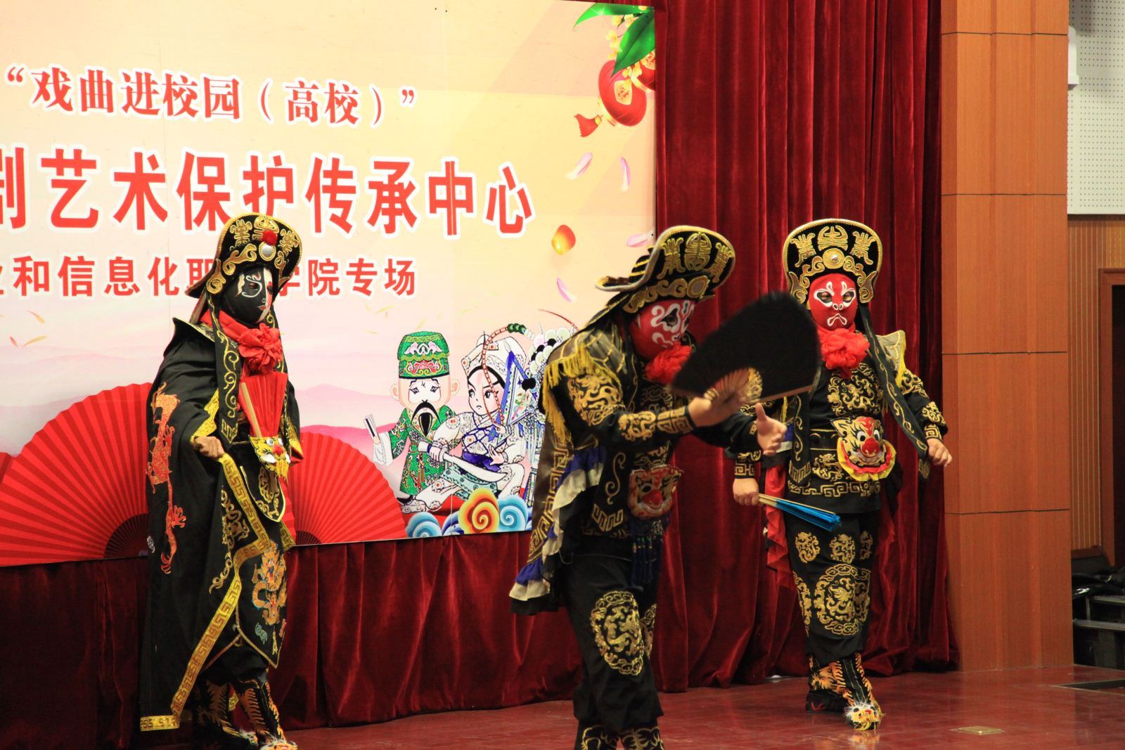 演出在川剧变脸的精彩表演中拉开帷幕。三位演员变幻莫测、精妙绝伦的变脸表演,一下子就吸引住了观众的目光,师生们一个个目不转睛,屏气凝神地“捕捉”着演员变脸的瞬间。变脸节目成功热场后,曲剧名家项英、侯庆祥、李卫红、刘艳丽、杨帅学、方素珍等先后登场,为师生们带来了《跑汴京》、《宋世杰告状》、《李天宝吊孝》、《风雪配》、《王宝钏》等剧目中的经典唱段,他们的唱腔或高亢激昂、优美婉转,也或诙谐淳朴、韵味悠长。字正腔圆、各具特色的演唱博得了台下观众一阵高似一阵雷鸣般的掌声。随后,尚珍珍、陈密林两位演员为大家表演了折子戏《拷红》,在不长的演出时间内,两位演员通过精湛的唱功把剧中角色丫鬟红娘的机智聪慧和老妇人的固执保守刻画的入木三分,准确传神。最后,素有“中原第一女丑”美誉的戏剧届著名笑星张晓英老师压轴登场,她和高玉明、孙战辉两位青年演员为师生们带来了曲剧小品《桑林收子》。演出过程中,张晓英老师收放自如、幽默滑稽的搞笑表演引得现场爆笑不断,掌声如潮。师生们在捧腹大笑的同时也真切感受了曲剧艺术的独特魅力。