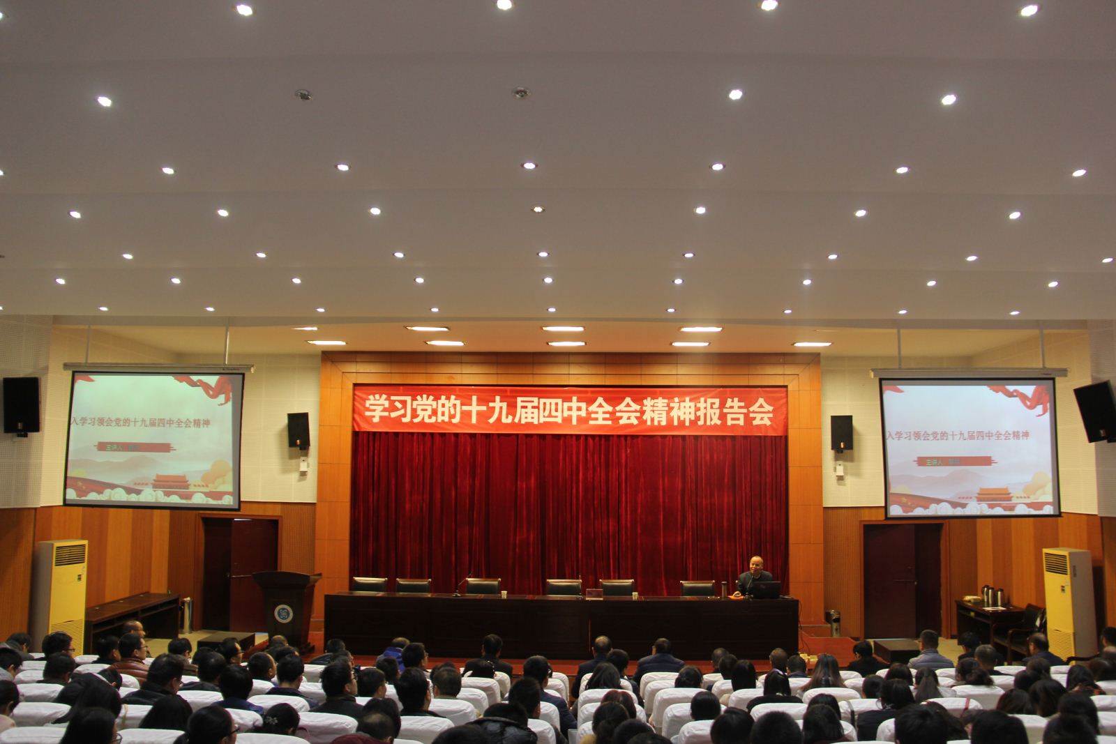 为深入学习贯彻党的十九届四中全会精神,我院于11月26日在多功能报告厅举办学习党的十九届四中全会精神报告会,邀请河南省委讲师团副团长、省委宣讲团成员郭兵教授以“深入学习领会党的十九届四中全会精神”为题为我院全体党员和辅导员进行宣讲。学院领导,各党总支、党支部书记,全体党员以及辅导员等300余人参加报告会,学院党委副书记陈荣邦主持报告会。