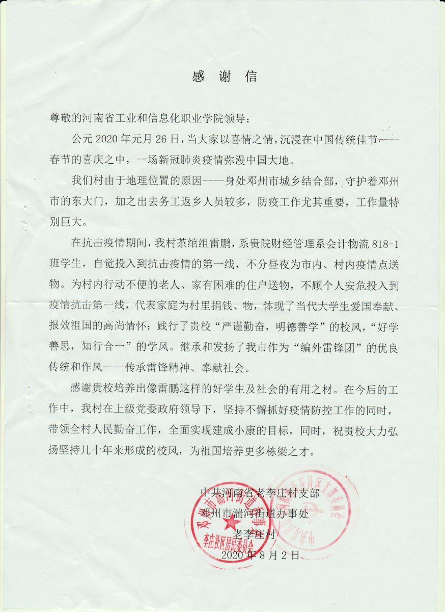 日前,我院收到一封来自邓州市湍河街道办事处、老李庄村党支部的感谢信。信中对我院财经商贸系财经物流518-1班雷鹏同学积极投身疫情防控志愿服务工作给予赞扬,对雷鹏同学在疫情防控的紧要关头,主动投身防疫一线,充分发扬志愿服务精神及认真负责的工作态度给予充分肯定。