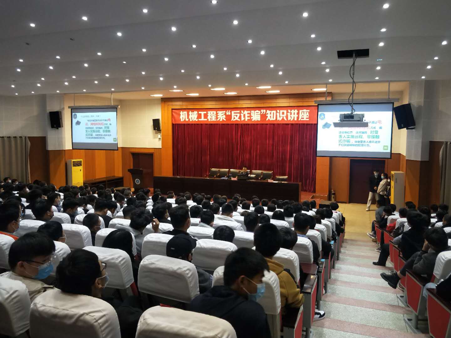10月27日晚,机械工程系在学院学术报告厅开展了“反诈骗”暨校园安全知识讲座,特邀焦作市公安局反诈中心朱哲警官、学院保卫处李长喜处长为主讲嘉宾。机械工程系辅导员、团总支学生会干部及2020级新生共计300余人聆听了讲座,讲座由机械工程系副主任白杨威主持。