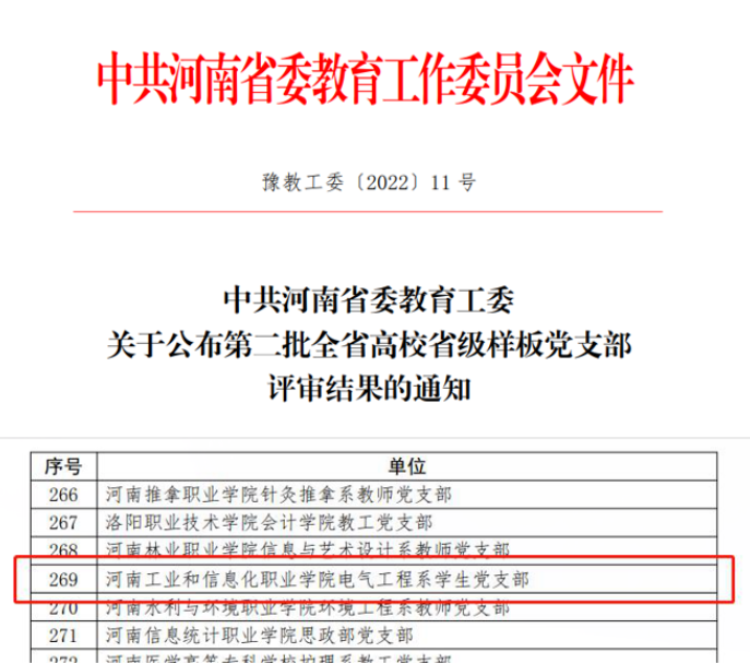 近日,中共河南省委高校工委公布了第二批全省高校省级样板党支部评审结果,经过基层自评申报、学校初评、省级专家评审,在全省各高校推荐申报的300余个基层党支部中,我院电气工程系学生党支部被确定为“第二批全省高校省级样板党支部”。这是对我院基层党支部建设工作的充分肯定,也标志着我院基层党建工作取得了新突破、迈上了新台阶。