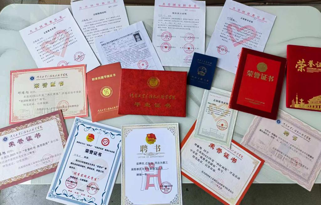邓缘旭在校期间先后获得2021年度“两红两优社团积极分子”和2022年度“两红两优优秀共青团员”等荣誉称号;2023年9月,获得河南工业和信息化职业学院三等奖学金。同时,邓缘旭多次参加学校的返家乡志愿活动。在志愿服务期间,邓缘旭获得安阳市殷都区团委颁发的“志愿服务”证书、“优秀实践大学生”证书、“大学生联盟副主席”聘书和“优秀青年志愿者”证书。